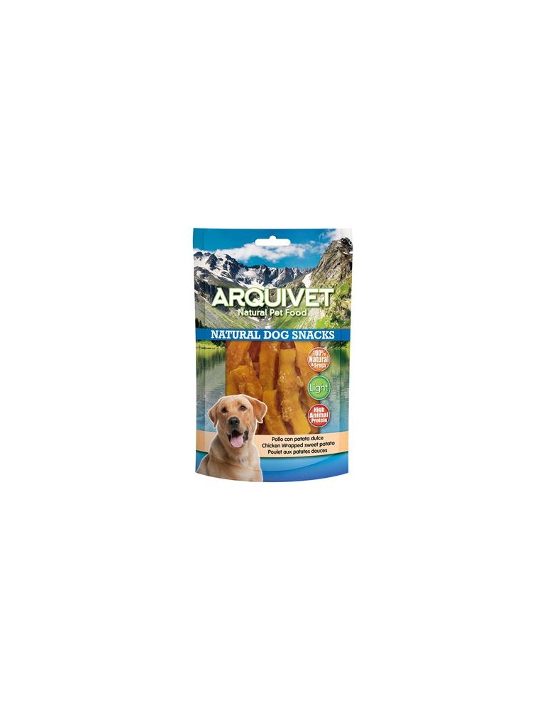 Snacks of potato and chicken meat rolled up. 100% natural. With a high content of animal protein and with few fats (light product). Complementary food for your dog, very rich in nutrients.