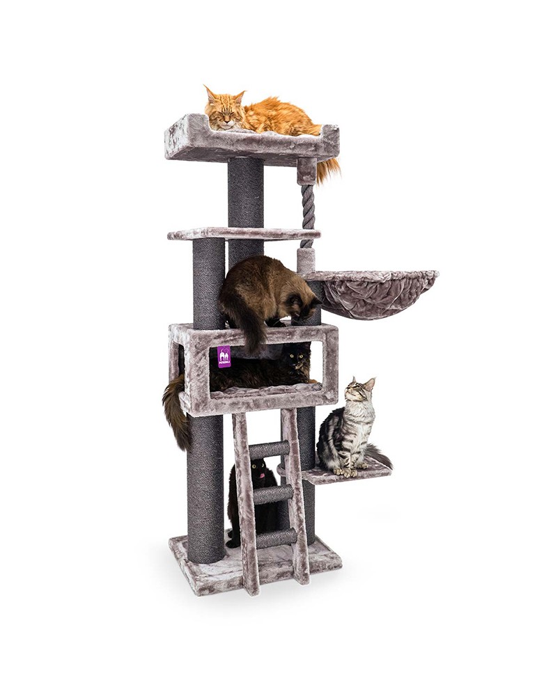 Want to impress your cat? Then get the party started with this more than complete, extra tall and robust scratching furniture from our Lucky Bastards collection. Here are the ingredients for a cool party: ladder, play rope, big trunks, small trunks, sofa bed, cuddle den, hammock, stable base plate, lounging areas, soft plush…What else?